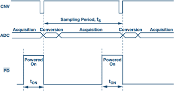 Figure 3 shows a simplified timing diagram for the ADC and driver amplifier. The system timing block (FPGA, DSP, and microcontroller) from Figure 1 provides the properly timed ADC conversion start (CNV) and amplifier power down (PD) signals. The SAR ADC initiates a conversion on the rising edge of CNV. The amplifier is powered on during the ADC acquisition phase for some period of time (tON) prior to the rising edge of CNV, and is then powered down synchronous with the rising edge of CNV. But what is the correct period of time for tON?