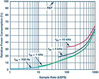 Using the ADA4805-1 and AD7980 previously mentioned and putting these concepts all together yields the curves in Figure 4. This figure shows the power consumption, in percent, of the dynamically power scaled ADC driver amplifier relative to the same amplifier when constantly enabled. The DPS efficiency is plotted for selected input frequencies to illustrate the effect of higher input frequencies on power consumption. The minimum tON was determined for multiple sample rates from 1 kSPS to 1 MSPS and is defined as the shortest tON that results in <0.5 dB erosion in SINAD (signal-to-noise and distortion) from the case with the amplifier constantly enabled. The figure shows that power savings up to 95% can be realized when processing slow input signals at low sample rates. But more importantly for higher throughput systems, the potential savings is still significant, up to 65% at 100 kSPS and up to 35% at 1 MSPS. It is important to note that Figure 4 reflects the performance of a single unity gain buffer in a continuously sampled system. However, as previously stated, these DPS concepts can be readily applied to the reference buffer with the expectation of similar results.