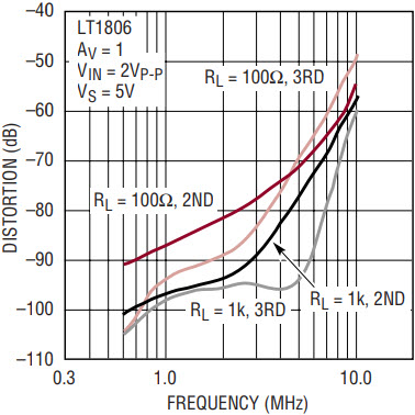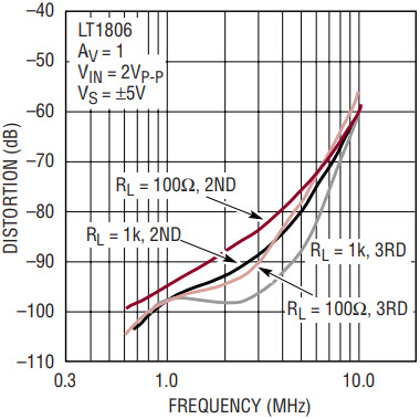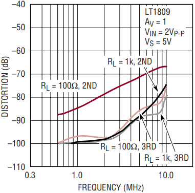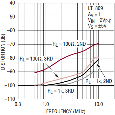 The distortion vs frequency for the two parts is shown in Figures 1–4. The harmonic distortion was measured with two loads: 100Ω, which is representative of a cable-driving application, and 1kΩ, which is typical of signal-conditioning applications. Both devices are quite good but the LT1809 provides the ultimate in distortion performance.