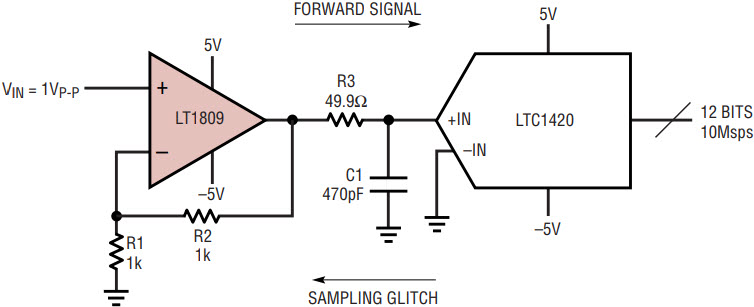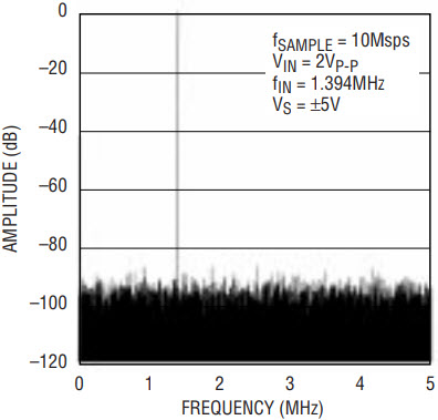 However, there is also a signal, the ADC sampling glitch, that travels from right to left. It is caused by a small flying sample capacitor in the ADC front end, which introduces an AC short circuit at the ADC’s input ten million times per second. This signal can cause grief to upstream circuitry unless means are taken to attenuate it. The LT1809 performs admirably in this task. Tracing the reverse signal path from the LTC1420, C1 serves as a storage capacitor and R3 limits the glitch current into the LT1809’s output. The LT1809’s collector output stage incorporates proprietary local feedback to reduce its output impedance (about 20Ω at 100MHz) and this helps attenuate the glitch as well. However, a remnant glitch persists and works its way through R2 and R1, being attenuated by a factor of 2 in the process, and arrives at the LT1809 inverting input. For best performance, the amplitude of the glitch at this point should have been reduced to several millivolts. If it is larger than about 25mV, the rule-of-thumb for BJT differential pairs, the input stage will begin to be driven outside of its linear region and excess distortion will result. The excellent results of Figure 10 indicate that the circuit is not suffering from this effect.