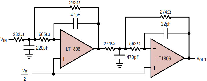 A low distortion, low voltage filter, suitable for antialiasing applications, is shown in Figure 5. The filter is a cascade of two inverting 2nd order sections, with values selected to give a Butterworth response. In this configuration, signal swing on the inputs of the op amps is small, resulting in good distortion performance. Distortion was measured at –83dBc at 1MHz, VO = 2.25VP-P. The overall filter response (Figure 6) shows a stopband that has greater than 95dB rejection of frequencies up to 100MHz. Such stopband depth would be difficult to achieve with a dual op amp because of crosstalk and layout issues.