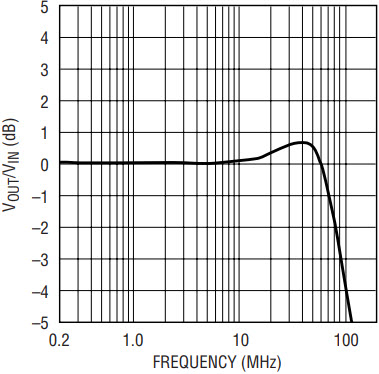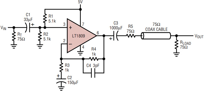 The high output current capability of the LT1809 can be put to use in video-cable-driver applications. Figure 7 shows an AC-coupled video driver using a single 5V supply. The input signal is level shifted to half supply by coupling capacitor C1 and resistor divider R1/R2. An AC gain of two in the amplifier, set by resistors R3 and R4 and capacitor C2, compensates for the loss due to the output termination resistors R5 and RLOAD, resulting in an overall gain of one. Figure 8 shows the frequency response of the driver. The –3dB bandwidth is about 95MHz and peaking is less than 1dB.