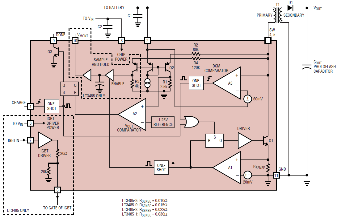 The LT3484 and LT3485 families of photoflash capacitor chargers suit about any photoflash need. The basic photoflash functionality in each part is identical and both parts are capable of operating from 2AA cells. The integrated IGBT drive and voltage output monitor differentiate the LT3485 from the LT3484, along with its higher current capabilities. The LT3484 is the smallest solution available if quenching the bulb is not needed. When using an IGBT to trigger the flash, the LT3485 offers valuable board space savings over the LT3484 by eliminating several external components. Table 1 shows the major functional differences between these seven parts.