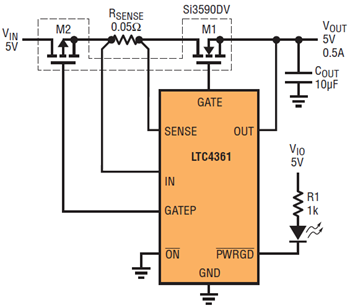 In addition to overvoltage protection, the LTC4361 and LTC4362 have overcurrent protection to protect the pass MOSFET from excessive current. The LTC4361 implements a 10% accurate 50mV electronic circuit breaker threshold with a 10µs glitch filter. A 50mΩ RSENSE connected between IN and SENSE implements a 1A overcurrent threshold as shown in Figure 1. The LTC4362 implements internal current sensing and has a 20% accurate 1.5A overcurrent threshold with a 10µs glitch filter. As in an overvoltage, an overcurrent activates a 30mA fast pull-down on GATE and releases the PWRGD pull-down. After an overcurrent fault, the LTC4361-1 and LTC4362-1 latch off while the LTC4361-2 and LTC4362-2 automatically restart after a 130ms delay.