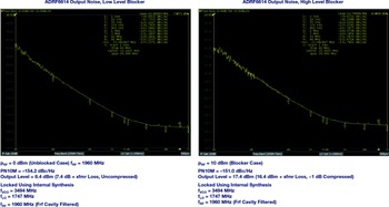 Figure 5. The plot compares the output noise spectrum of the ADRF6614 receiver IC with low and high level blocking signals (left and right, respectively).