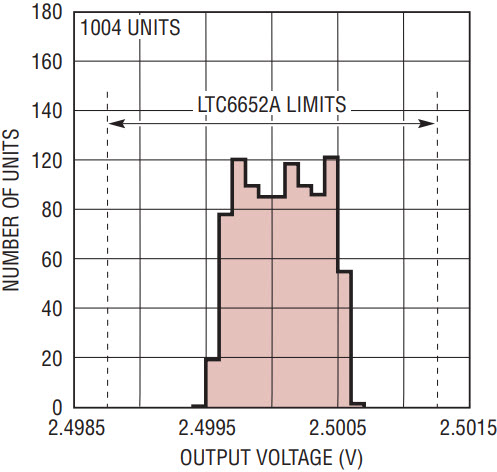 The LTC6652 reference is a precision low drift voltage reference that includes advanced curvature compensation circuitry and post-package trim. To guarantee reliable performance, these parts are tested at –40°C, 25°C and 125°C to verify they meet specification across the entire temperature range. This comprehensive testing ensures that the LTC6652 can be used with confidence in demanding applications. One result of this testing is demonstrated in Figure 1. The output voltage versus temperature for several randomly chosen parts shows a drift characteristic that is consistent from part to part. This is a result of a proprietary curvature compensation circuit that tracks the operating conditions and the manufacturing process, yielding consistent results. Figure 2 shows a typical temperature drift distribution of randomly selected production tested LTC6652s, illustrating how well the design and testing methodology works. Finally, the initial accuracy distribution is tightly controlled, as shown in Figure 3.