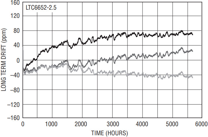The three curves shown in Figure 5 give a general indication of how much long-term drift to expect. The typical specification is 60ppm/√khr, which translates into 150µV drift. Combining the typical thermal hysteresis and long-term drift numbers yields 165ppm. To put this in perspective, the LTC6652 temperature coefficient is typically 2ppm/°C over 165°C temperature range, which yields 330ppm due to drift alone. The combined thermal hysteresis and long-term drift is half this number (or just 20% of the maximum drift specification). The superior thermal hysteresis and long-term drift performance of the LTC6652 ensures accuracy and reliability over the product lifetime, virtually eliminating the need for field calibration.