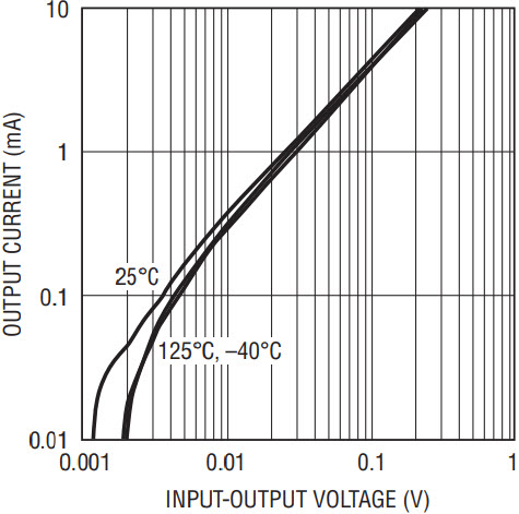 The LTC6652 reference family has seven output voltage options to choose from, making it suitable for a variety of today’s demanding applications. These options are 1.25V, 2.048V, 2.5V, 3V, 3.3V, 4.096V, and 5V. For low input voltage requirements, the 1.25V and 2.048V options work with input voltages down to 2.7V. The other five options require only 300mV input-to-output headroom while fully loaded, and they require less headroom with a reduced load or while sinking current. Popular application requirements, such as a 2.5V reference operating on a 3V supply, or a 4.096V reference operating on a 5V supply, are easily accommodated. For high input voltage requirements, all voltage options work up to 13.2V. Regardless of input voltage the LTC6652 maintains its excellent accuracy as shown in the line regulation plot in Figure 6. A plot of the dropout voltage for both sourcing and sinking current is shown in Figures 7a and 7b, respectively.