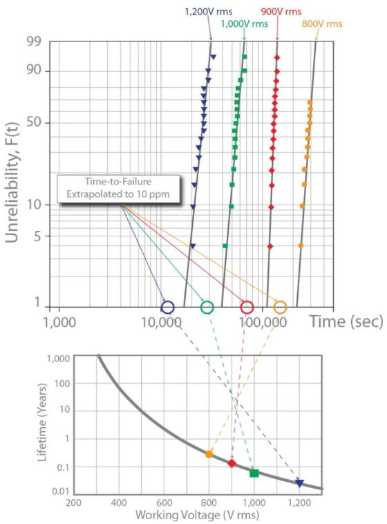 このデータは 800 V から 2000V rms の範囲で 60Hz の同相電位差をサンプルに印加して測定したものです。4 個の各デバイスについて故障時間を記録し、以下のワイブルプロットにまとめました。実際に使用される動作電圧範囲まで低めた電圧での故障時間を外挿しました。