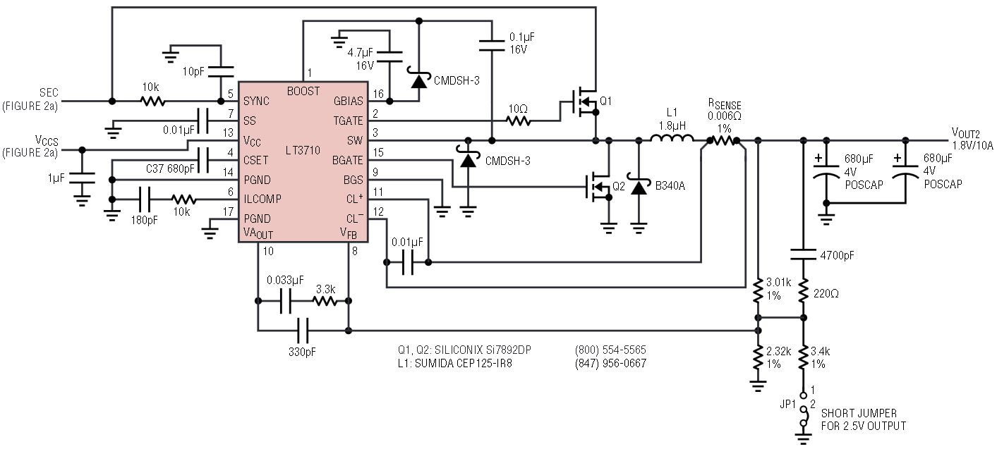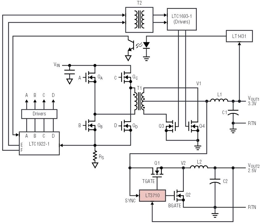 Many telecom, server and other applications require an isolated power supply with multiple output voltages, but maintaining tight regulation for all of the output voltages can be a power supply designer’s headache. Traditionally, a linear regulator is used for each auxiliary output, but efficiency of a linear regulator can be very low, limiting its usage to low output current applications. One alternative to the linear regulator is to use a buck converter as a post regulator. This method can yield better efficiency, but the power supply needs a larger output inductor and capacitor if the post regulator cascades the main output; or it needs an additional rectifier, inductor and capacitor before the post regulator if multiple secondary windings are used. The additional power conversion stage and components increase conduction losses. Another option is to use a magnetic amplifier post regulator. The efficiency of a magnetic amplifier post regulator can be high, especially for low or medium current applications, but is usually low in high current applications. Furthermore, its complex assembly and poor regulation at light load make it less than a perfect solution. A better alternative is a post regulator design that uses the new LT3710.