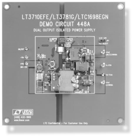 This circuit provides 1500V input-to-output isolation at switching frequency of 230KHz. Additional features include primary side on/off control, ±5% secondary side trimming on the 3.3V output, input overvoltage protection, undervoltage lockout and board thermal shutdown. The entire circuit is mounted on a standard half brick size PC board with about a half inch height. Figure 3 shows a top side picture of the board.