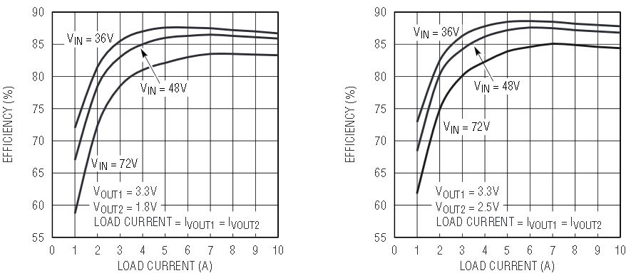 Figure 4 shows the LT3710 post regulator input voltage, switch node voltage and inductor current waveforms with 48V input to 3.3V/10A and 1.8V/10A outputs. The efficiency curve of this circuit is shown in Figure 5. With a 48V input and full loads on both main and auxiliary outputs, measured total efficiency is about 86%.