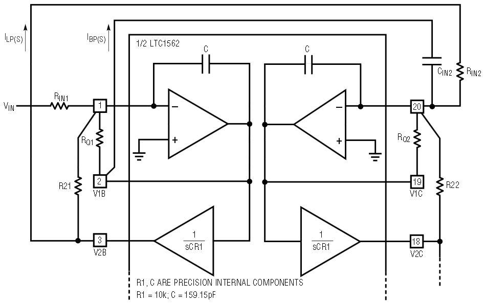 The principle of the RC notch technique is shown in Figure 1, where one 2nd order section of the LTC1562 is connected as a basic all-pole 2nd order lowpass/bandpass filter and its two outputs are summed directly into the next section by means of resistor RIN2 and capacitor CIN2.