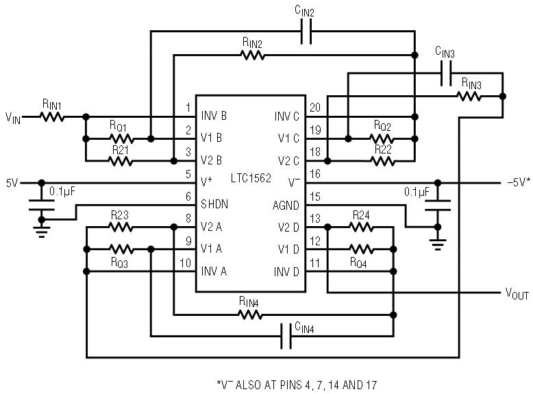 The technique of Figure 1 can be expanded to create high order filters with stopband notches. This is shown in Figure 2, where all four sections of an LTC1562 are used to create an 8th order filter. The notches, as in Figure 1, are formed by summing the two voltage outputs (V2i, V1i) via (RINi, CINi), respectively into the inverting node of the following section. As shown, Figure 2 supports three notches. A fourth notch can also be produced if the V2D, V1D outputs are summed into the inverting input of an external op amp.