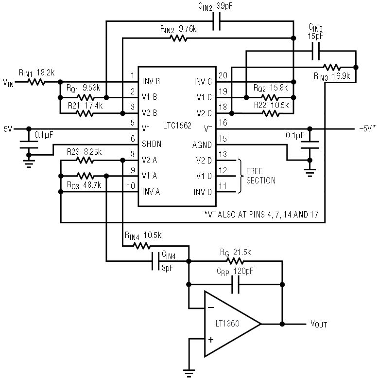 Figure 3. Cascading three sections of an LTC1562 to form a 7th order lowpass elliptic response.