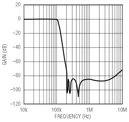 The active devices are the LTC1562A and the LT1360 op amp. Figure 4 shows the filter gain response. The measured passband error is 0.15dB and the total output RMS noise is 60µVRMS. With a dual 5V supply, the filter can easily provide a 5V peak-to-peak signal with a 90dB signal-to-noise ratio and better than 0.01% distortion. The attenuation of the filter remains below 80dB for input frequencies up to 6MHz.