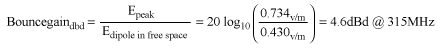 図15および16から、自由空間における理想的ダイポールとグランドバウンスから発生するピーク電界の差は次のようになることがわかります。