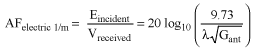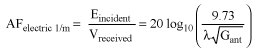 アンテナは電界を取りこみ、それを50Ωのシステムで測定される電圧に変換するために、次の共通式が使用されます³。磁気的に結合したまたは50Ω以外の環境の場合は、AF式は該当せず、上の式とはかなり異なります。最後に、レシーバの測定電圧から電界レベルを求めることができます。