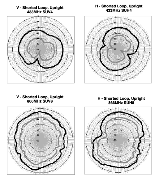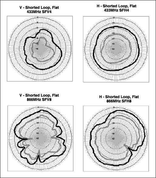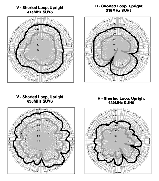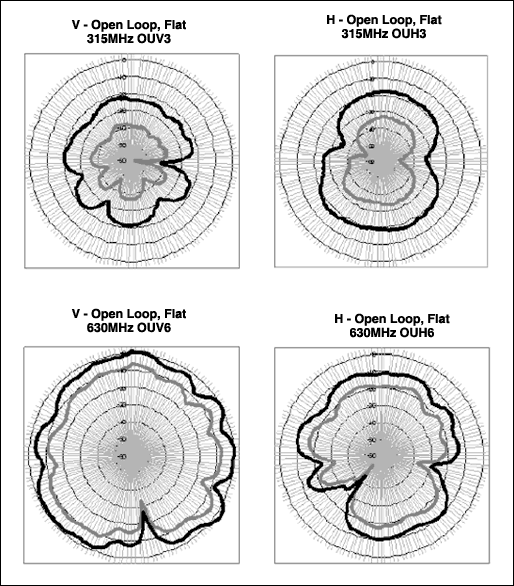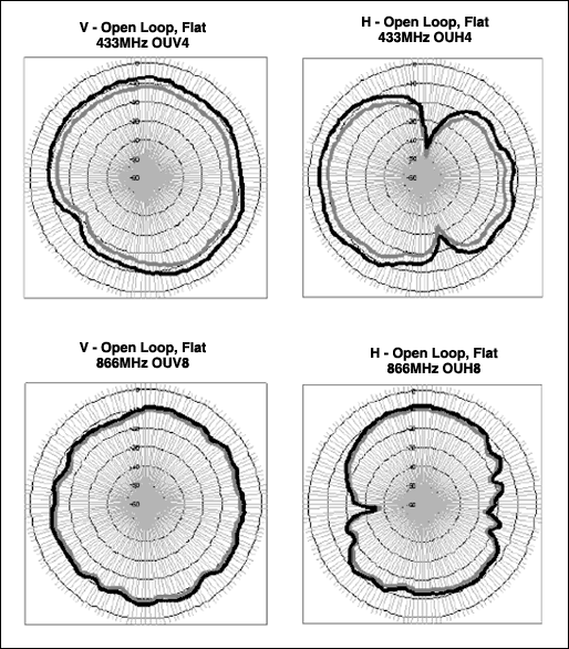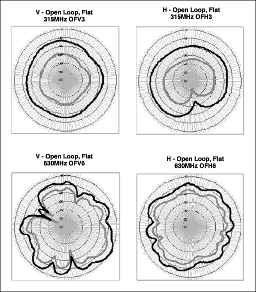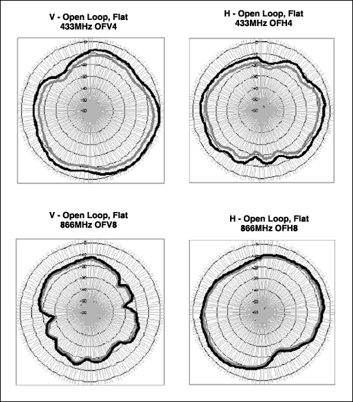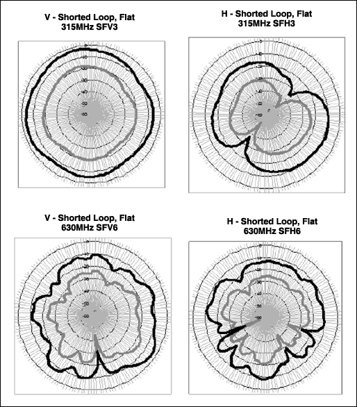 オープンループとショートループとのシミュレーション結果を比較すると、測定データもオープンアンテナのシミュレーションを実証しています。基本波と高調波の電界パターンはショートループに比べやや均一的です。このことは実際面では興味深いですが、アンテナ自体が向上するのではなく、同軸ケーブルシールドはアンテナの高効率と平坦性において重要な要素を占めることを思い起こしてください。また、波長が短くなるにつれて、アンテナ効率も向上します。433MHzの電界は標準で-10dBdを上回り、315MHzの電界はおよそ-15dBd~-20dBdです。ただし、平均して433MHzを上回る電界強度である高調波は除外します。