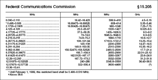 FCCの試験ラボでは、こうした保護帯域におけるデバイスの試験時にさらに別のFCCの表をチェックします。