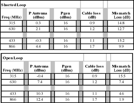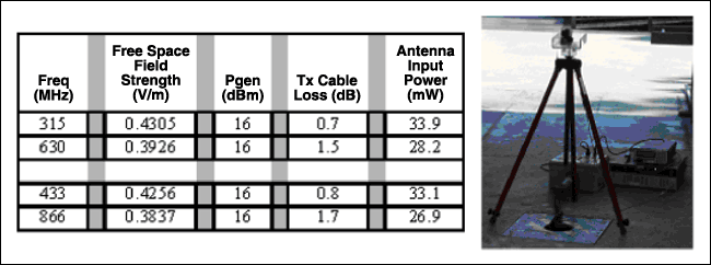 表2は、16dBmに設定された信号発生器で駆動されるダイポールの場合の上記から計算された電界強度を示しています。