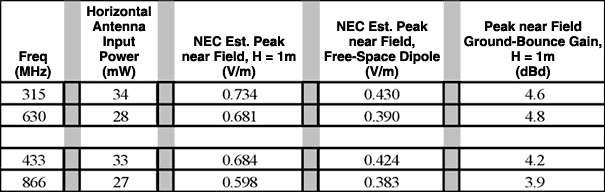 第2次高調波など、315MHzおよび433MHzの電界強度におけるグランドバウンスの理論的な影響を検討するために、NECは3mの距離で近傍界を推定しました。この分析は、グランドから(地上) 1mの基準ダイポールにもたらされた表2からの実際のRFレベルを考慮しました。