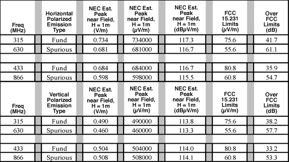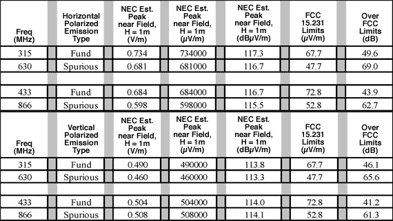 こうしたFCCのパートで許容されるトランスミッタ放射は、ドア自動開閉装置、アラーム、および非周期的なスイッチ制御で使用されるような実質的にランダムで突発的なバーストデバイスです。FCCパート15.231では、音声やデータなどの連続伝送が許容されないのと同様に、おもちゃの制御などアプリケーションにおいて制御情報の多いトラフィックを禁止していることに注意してください。