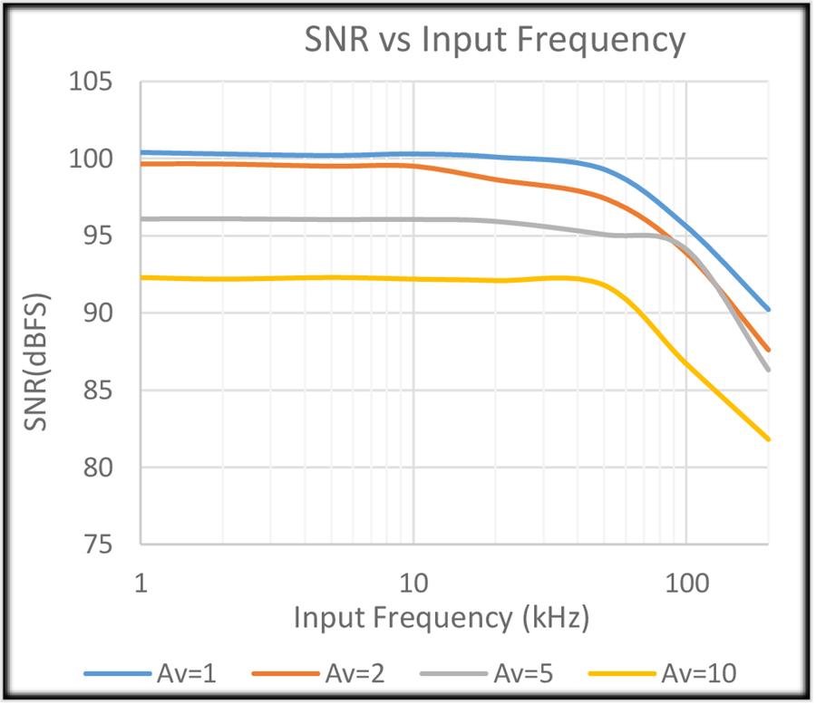 Looking at Figure 3 which shows SNR performance vs input frequency for gains of one through ten, it can be seen that the SNR starts at 100dB for an input frequency of 1kHz and gains of one or two but falls off as the input frequency and gain rises. At gains of one to five, SNR is reduced to 92dB beyond 100kHz. At a gain of ten, SNR is reduced to 92dB above 50kHz. With a gain of one or two, SNR performance is similar to the datasheet typical curve suggesting that performance is limited by the ADC. With gains of five or ten, the LT6237 limits the SNR performance.