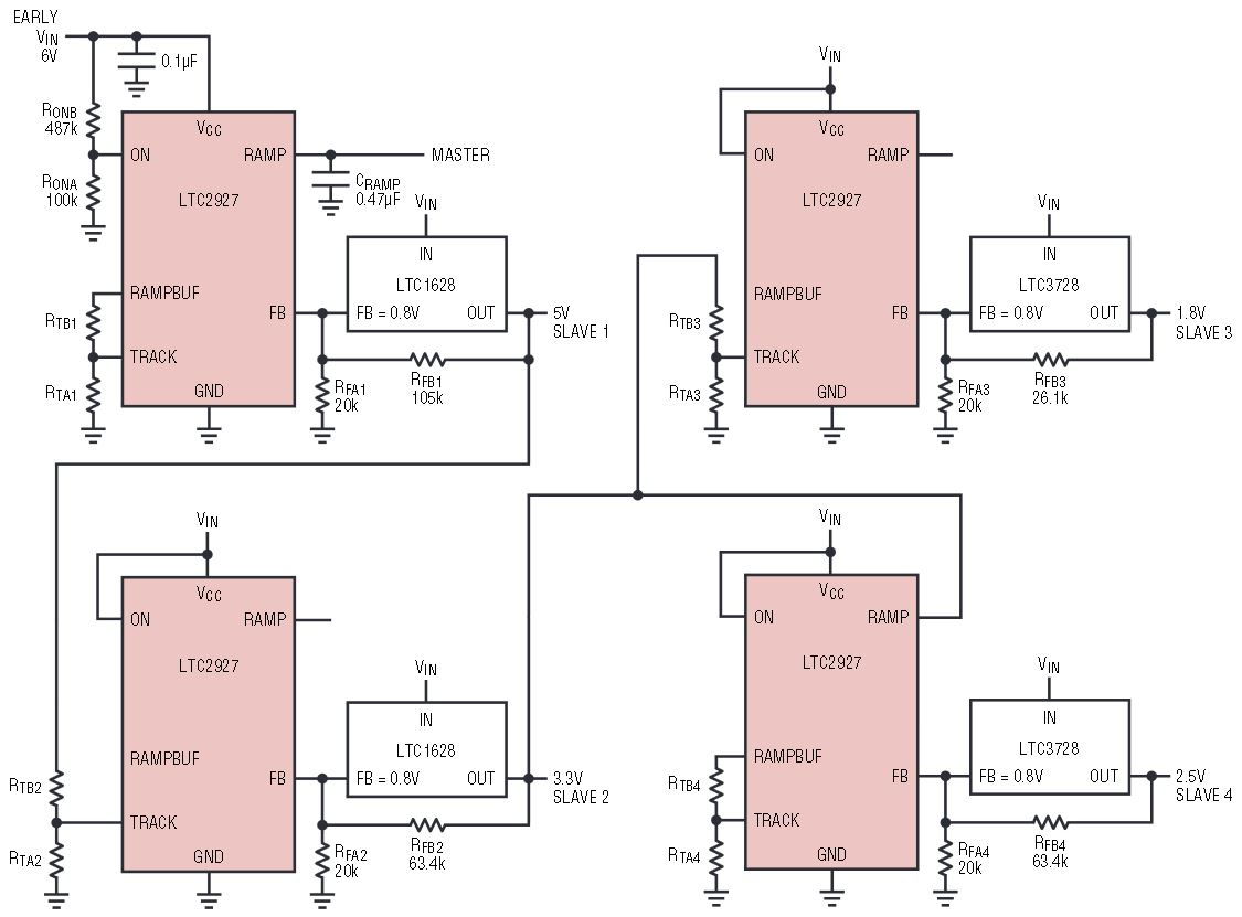 Consider a complex tracking system. The schematic in Figure 1 uses an LTC1628 dual synchronous step-down converter to produce 5.0V and 3.3V supplies and an LTC3728 dual synchronous step-down converter to produce 2.5V and 1.8V supplies from a 6.0V input. Four LTC2927s connected to the feedback nodes control the ramp-up and ramp-down behavior of these supplies. An early VIN is supplied to the devices to guarantee correct operation prior to tracking the supplies.