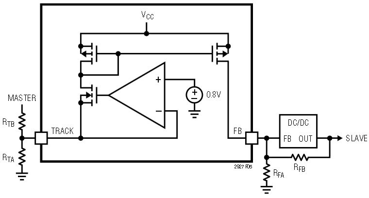 Many voltage tracking solutions use series MOSFETs, which adds an in herent voltage drop, additional power consumption, and extra PC board real estate. Instead, the LTC2927 controls supplies by injecting current directly into the feedback nodes, thus controlling supply outputs without series MOSFETs. Figure 3 shows the simple “tracking cell” used to inject this current. Furthermore, power supply stability and transient response remain unaffected because the injected current from the LTC2927 offsets the output voltage without altering the power supply control loop dynamics.