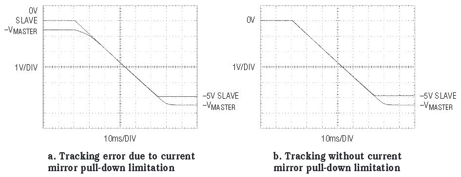 Figure 6a shows the tracking profile of Figure 5 with a ramp rate of 100V/s. VMASTER is positive, but the inverse is shown for clarity. The –5V slave does not pull all the way up to 0V at VMASTER = 0V. This is because the ground referenced current mirror cannot pull its output all the way to ground. If the converter has a FB reference voltage greater than 0V or if a negative supply is available for the current mirror, the error can be removed. The resulting waveform is shown in Figure 6b.