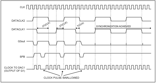 MUX-DAC1のクロック経路にANDゲート(G1)を挿入することで、MUX-DAC1に与えるクロックの操作が可能になります。ANDゲート(G2)は、遅延を整合させるためにMUX-DAC2へのクロック経路に挿入しています。XORゲート(G3)は、位相検出器の役割を果たします。DATACLK1とDATACLK2の出力が異なるとき、「1」が出力されます。G3out = 「1」であれば、MUX-DAC1へのクロックパルスを「スワロー(飲込み)」処理して、CLKの1クロック周期分だけDATACLK1のエッジをシフトさせます。G3の出力(G3out)の立上りエッジを、FF1とG4で構成された正のエッジ検出器(PED)で検出します。立上りエッジを検出すると、PEDは1クロックサイクルの間「0」を出力します。次にこの信号がFF2によってタイミング変更されてからG1に印加され(SPB)、結果としてMUX-DAC1へのクロックパルスが1つ抑止されることになります。これによって、CLKの1クロックサイクル分だけDATACLK1が遅延します。数クロックサイクル後には、図5に示すように、DATACLK1の遅延がDATACLK2と揃うことになります。DACのクロック信号のグリッチを防ぐため、クロックの立下りエッジでフリップフロップの更新を行うことが重要です。この方法を使用する場合、両方のMUX-DACへの入力のタイミングは同じになります。ルーチン内の遅延も計算に入れることが重要であり、2つのフリップフロップのセットアップ時間とホールド時間の整合を取ること、およびクロックがローのときにSPB信号のパルスをG1に印加することを確実に行ってください。さもないと、クロック信号にグリッチが発生する恐れがあります。また、ジッタの発生を最小限に抑えるため、クロック同期回路への給電はノイズの無い電源によって行うことが推奨されます。