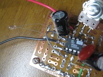500Ω、B特(回転による抵抗値の変化がリニアなもの)のボリュームを入手し、形として完成した試作基板を図15に示します。
