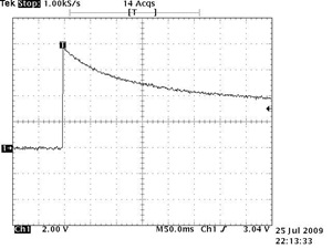 まずはランプによる利得制御回路がどんな風になるのか?という点を測定してみました。ランプのフィラメントの温度に依存しているようで、複数回オン・オフしてみると、電源投入時の初期利得が大きくなったり、低めになったりしています。