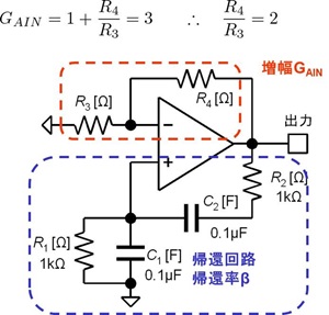OPアンプなどは「負」帰還が用いられますが、発振させるためには「正」帰還としてフィードバックして、振幅動作を増長させるように回路を動かします。発振させるには、図2の左側の入力は不要になります。正帰還の発振条件は、
