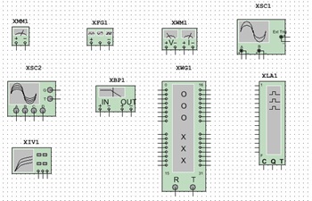波形観測できるツール群を紹介しましょう。これらは「仮想測定器」というツール群です。SPICE解析上での面倒な解析パラメータを入れることなく、SPICEで言う、いわゆるProbe機能の設定をほとんどせずに、まるで半田付けして測定器で測定する感覚でシミュレーションできます。上の左から、マルチメータ、ファンクション・ジェネレータ、電力計、オシロ(2CH, 4CH)、ボーデ・プロッタ、ワード・ジェネレータ、ロジアナ(!)、カーブトレーサです。これ以外にもツールがあります。