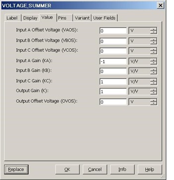 利得Aは10000倍 = 80dB、帰還量βはβ = 1/(1 + 9) = 1/10 = -20dBです。図4中に+記号が3つある、A3というものは、図5のように設定するVOLUTAGE_SUMMER(電圧加算器)で、このようにA入力をマイナス1倍(反転入力端子に相当)、C入力をプラス1倍(非反転入力端子に相当)としてOPアンプの差動入力を模倣することができます。