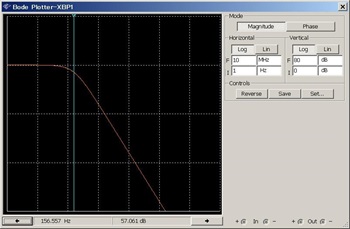シミュレーション結果を図6に示します。仮想計測器ボーデ・プロッタで得られる表示です。Aβ=60dBの計算どおりで、-3dB周波数もマーカ読みで156Hzになっています。関心するほど良く出来た測定方法なわけですね。