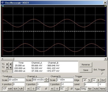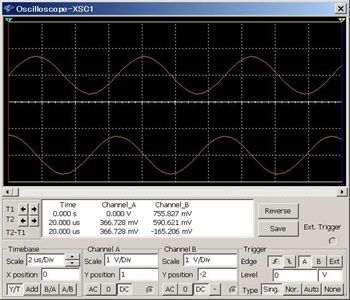 今度はV1の両端子に仮想オシロスコープを接続して確認してみました。
