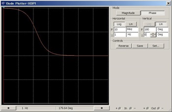 上記で示したAβは、仮想計測器の「ボーデ・プロッタ」を使って表示させることができます。図4の上側の部品がそれです。ボーデ・プロッタは横軸を周波数として、縦軸をOUT/INの比としてシミュレーションできます。
