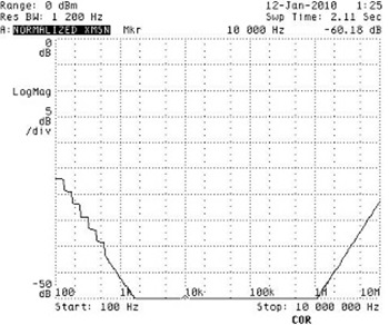 図7, 8と同じ条件で測定してみました(図10)。ESRが低いのでアウトレンジになっています。そこで10dB/divに変えてみました(図11)。このプロットからもESRがかなり低いことが分かりますね!