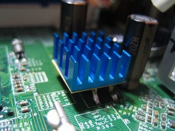 図4は取り外したコンデンサです。図5はPCB(Print Circuit Board)上のようすですが、ミニタワーのためMB(PCB)は縦付けです。図5のようにプロセッサの上に問題の電源回路があり、プロセッサの熱が上側に上がってきて、この電源回路(コンデンサ)が周囲温度から上昇してしまうという残念な構造です。