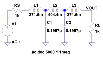 さてともあれ、上記の計算手順から、図3の𝐿1,𝐿3に相当する抵抗は271.5 mΩ、𝐿2相当は404.4 mΩとなります。これは非常に低い抵抗値です。そのため図5では基準となるインピーダンスを1000倍してあり、271.5 Ω、404.4 Ωとして常用的な素子定数に、また他の素子定数もそれぞれインピーダンスが1000倍になるように構成してあります。図3の素子定数から図5に相当する素子定数をそれぞれ直接得てみると、一般的にその定数が不適切になります(上記の𝐿1,𝐿2,𝐿3の例もそうですね)。
