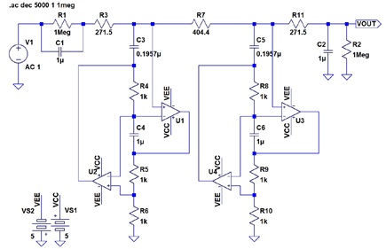 図5においては、𝐶1, 𝐶2に並列に抵抗が接続されています。これは図10のGIC回路のところでも説明しましたが、FDNR型フィルタを構成するために本質的に必要なものではなく、フィルタ内のOPアンプにバイアス電流を供給する(直流経路を形成する)都合があるためです。入出力のコンデンサ𝐶1, 𝐶2(もともとは図3の𝑅𝑆,𝑅𝐿に相当するもの)に並列に抵抗𝑅1,𝑅2を接続し、バイアス経路を確保します。こうしないとOPアンプが正しく動作できません。