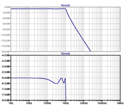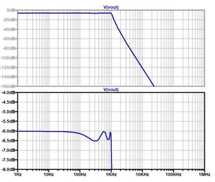 FDNR型フィルタの注意点としては、図3の原型LCフィルタが基本になるため、入出力振幅が1/2(-6dB)になることです。このようすは原型LCフィルタを図6に、FDNR型フィルタを図7に示しています。