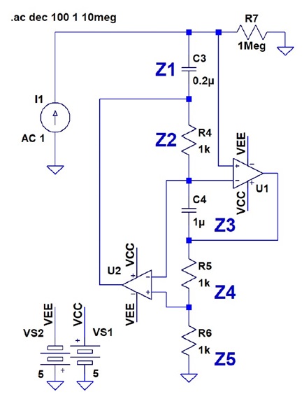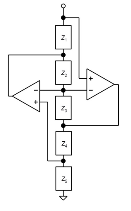 FDNRは図8のGIC(Generalized Impedance Converter)回路というもので構成します。GIC回路は任意のインピーダンスを構成できる回路です。GIC回路は図8のグラウンドに向けて接続される複数の直列素子経路と、そこにつながる2つのOPアンプから形成されます。そして端子𝑍𝑖𝑛から見たインピーダンスを