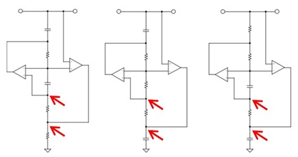 の4種類の方法があることに気がつきます。でも④は実用的ではありません。[7]のFigure 8.47に回路図として、①~③の3トポロジの説明がありますが、残念ながら下の2素子とOPアンプとの接続点に間違いがあるようです(それでも一応図9に示しておきます)。