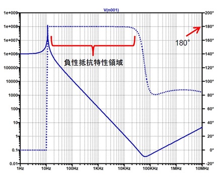 シミュレーション結果を図11に示します。20Hzから20kHzに亘って位相が180°になっています。位相が180°とは、この周波数帯でこの回路が「負性抵抗特性」を示すことに相当します。式(11)を図10の部品番号に置き換えておくと、