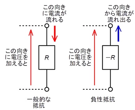 いっぽう同図中の右が「負性抵抗」となるもので、図中の向きに電圧を加えると、左の「一般的な抵抗」と逆に、加えた方向に向かって電流が流れ出る(青矢印のように上方向に、抵抗から出てくるように)ことになります。負性抵抗では電流の流れる向きが逆なわけですから、オームの法則としても