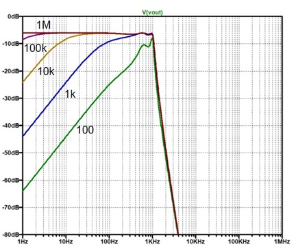ためしに図5の出力VOUTに負荷抵抗を接続して周波数特性をシミュレーションしてみたものを図13に示します。LTspiceの.stepディレクティブで負荷抵抗値を100Ω, 1kΩ, 10kΩ, 100kΩ, 1MΩとしていますが、図7と周波数特性がおおきく異なっていることが分かります。当然ながら負荷抵抗値を低く(重く)すると劣化が大きくなります。